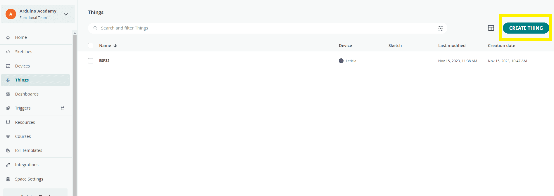 To use a device in Arduino Cloud, you need to create a Thing, or associate it to an existing Thing. A Thing is the digital twin of your device, like a reference to the actual hardware used to implement them. Each Thing is represented by a collection of properties, the configuration of some variables and other settings, as well as the history of the data collected for those variables.