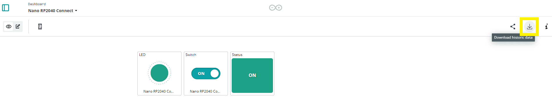 To start exporting your data locally, navigate into one of your dashboards on the Arduino Cloud. While inside a dashboard, press the Download icon in the upper right corner. This will open a new window that will allow you to select which historical data you would like to download.