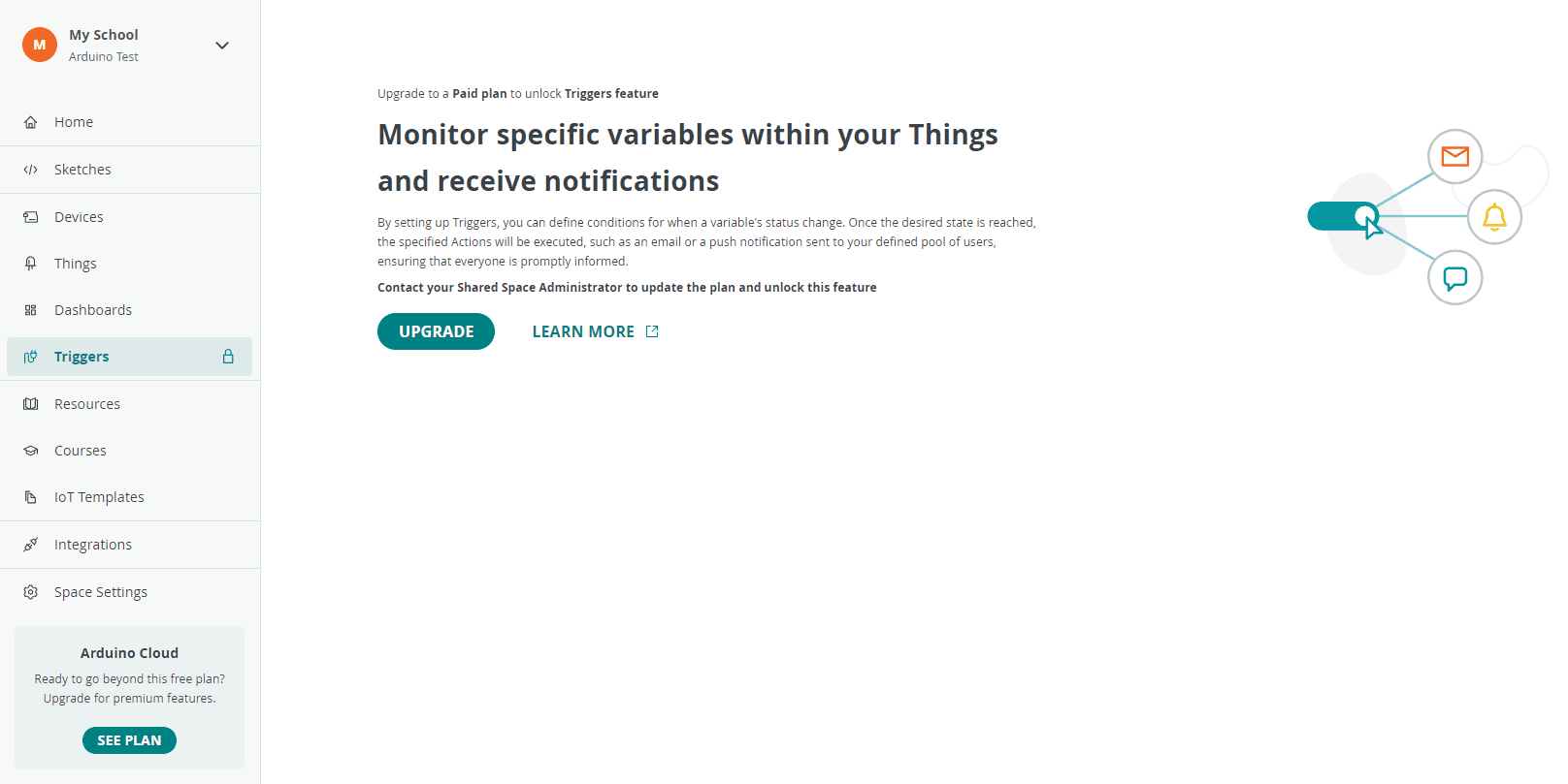 .Congratulations! Now you own a School Plan linked to your Arduino account. You should have received a confirmation email. Continue reading to discover more about the additional functions you've now unlocked.