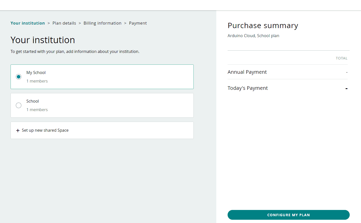 If you're not logged in with an Arduino account, you'll be redirected to the login page. If you've already created a Shared Space select the institution Space you want to add your members' seats to or click Set up new shared Space to make a brand new one.