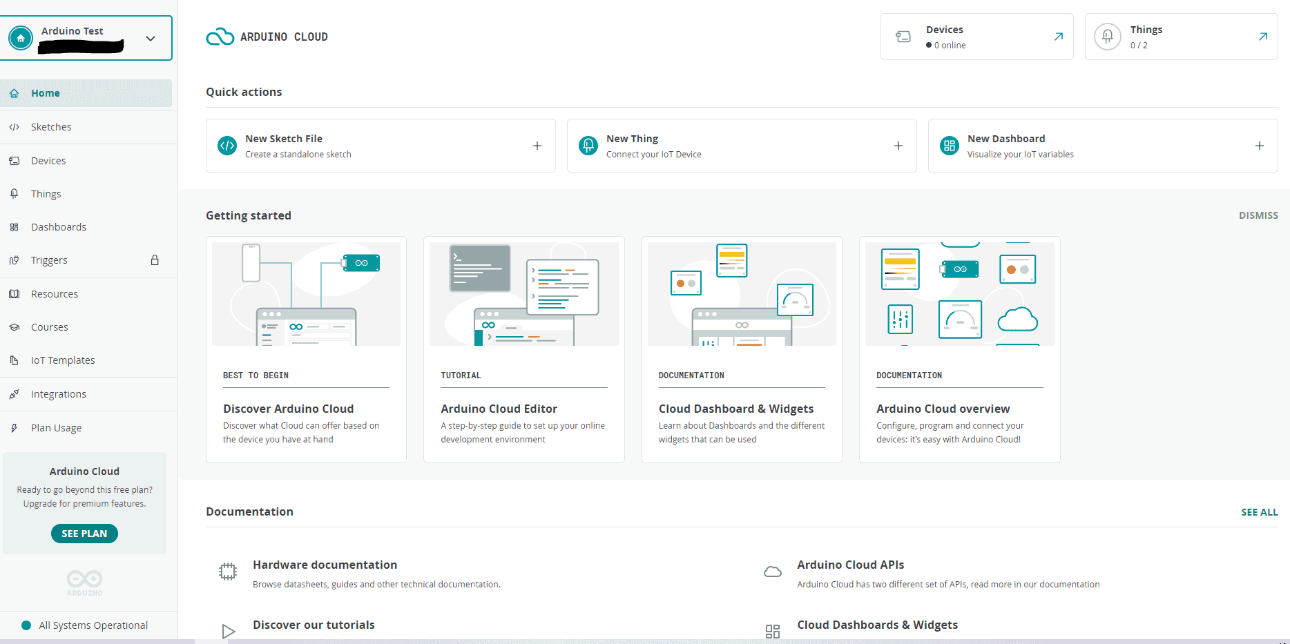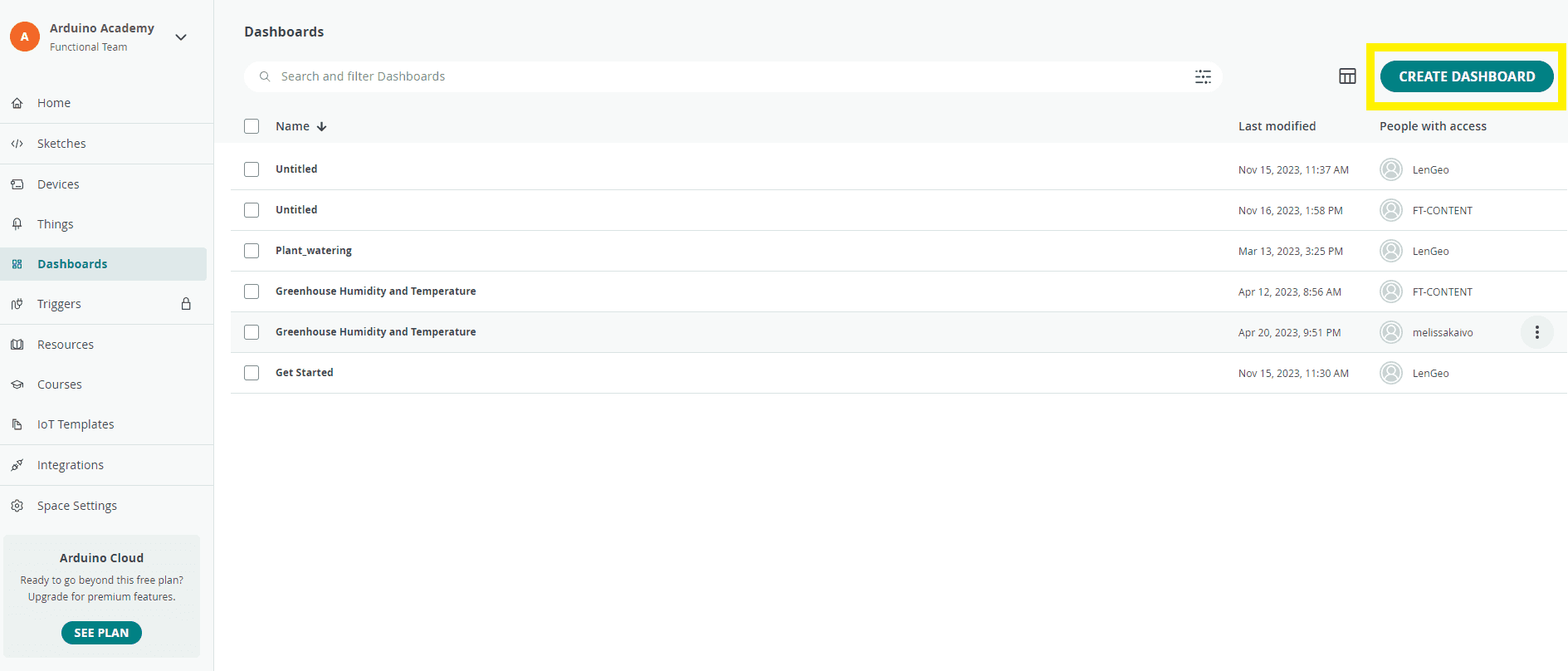 By default, any new user who created an Arduino account has access to Arduino Cloud with a Free Plan.