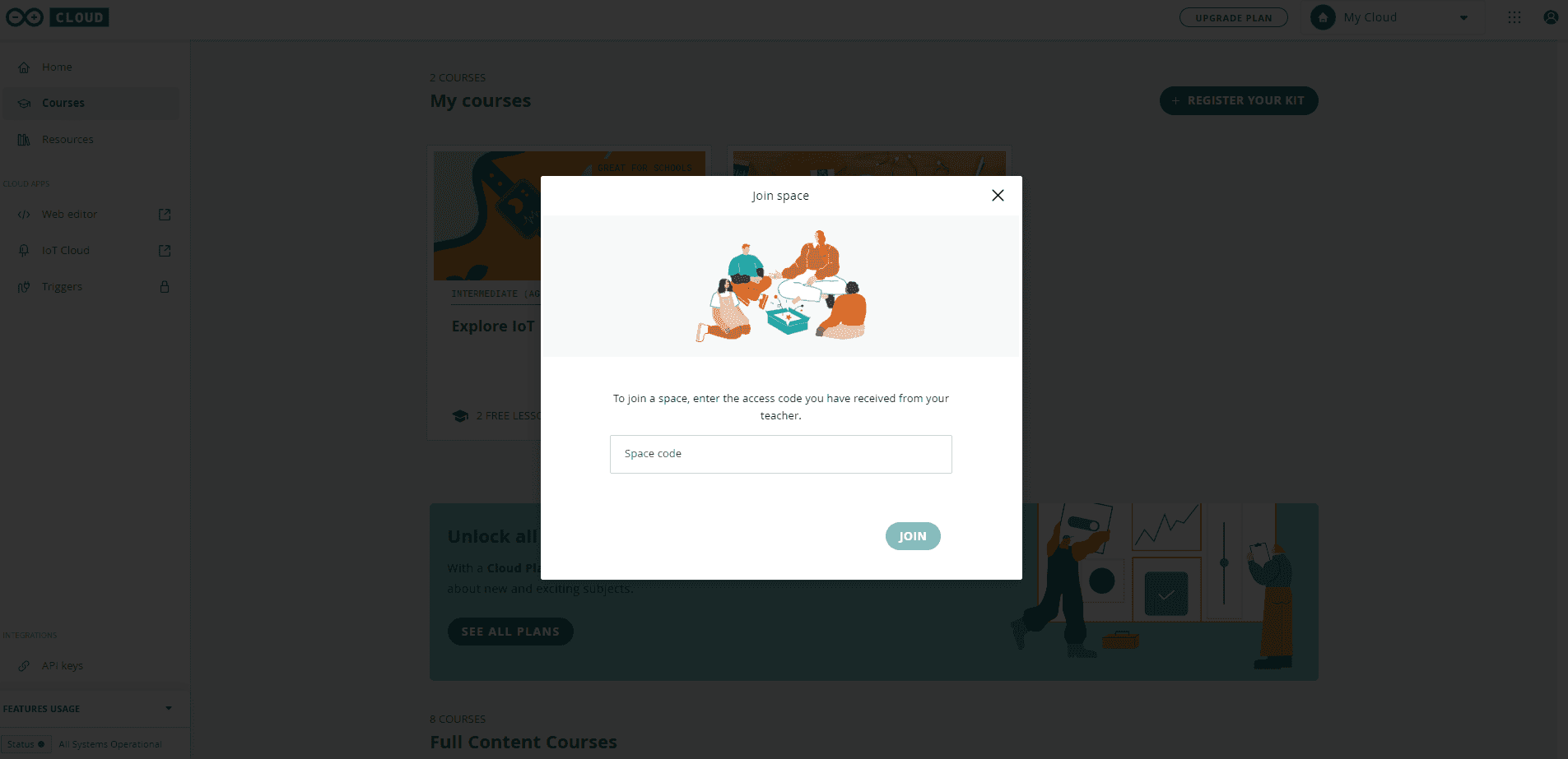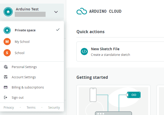 Private Space. Private space is an automatically created private space once joined Arduino Cloud. You can use this space for personal projects you do not want to share with all your class. This space is free and includes