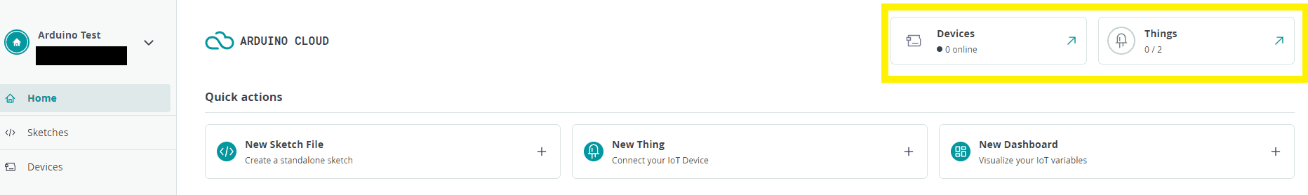 On the left menu bar in https://app.arduino.cc/, all the elements you will use to set up your IoT projects for a quick access are listed:
