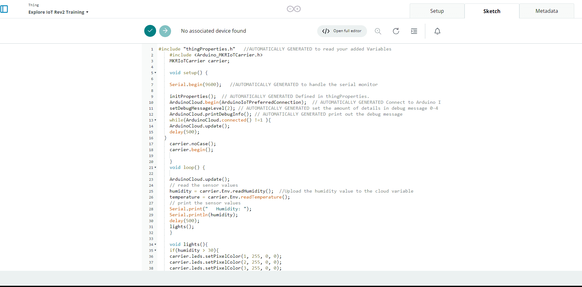 When we create variables here, they are automatically generated in a sketch, and when we upload the code to the board, the variables used in the sketch synchronize with the variables in the Cloud.