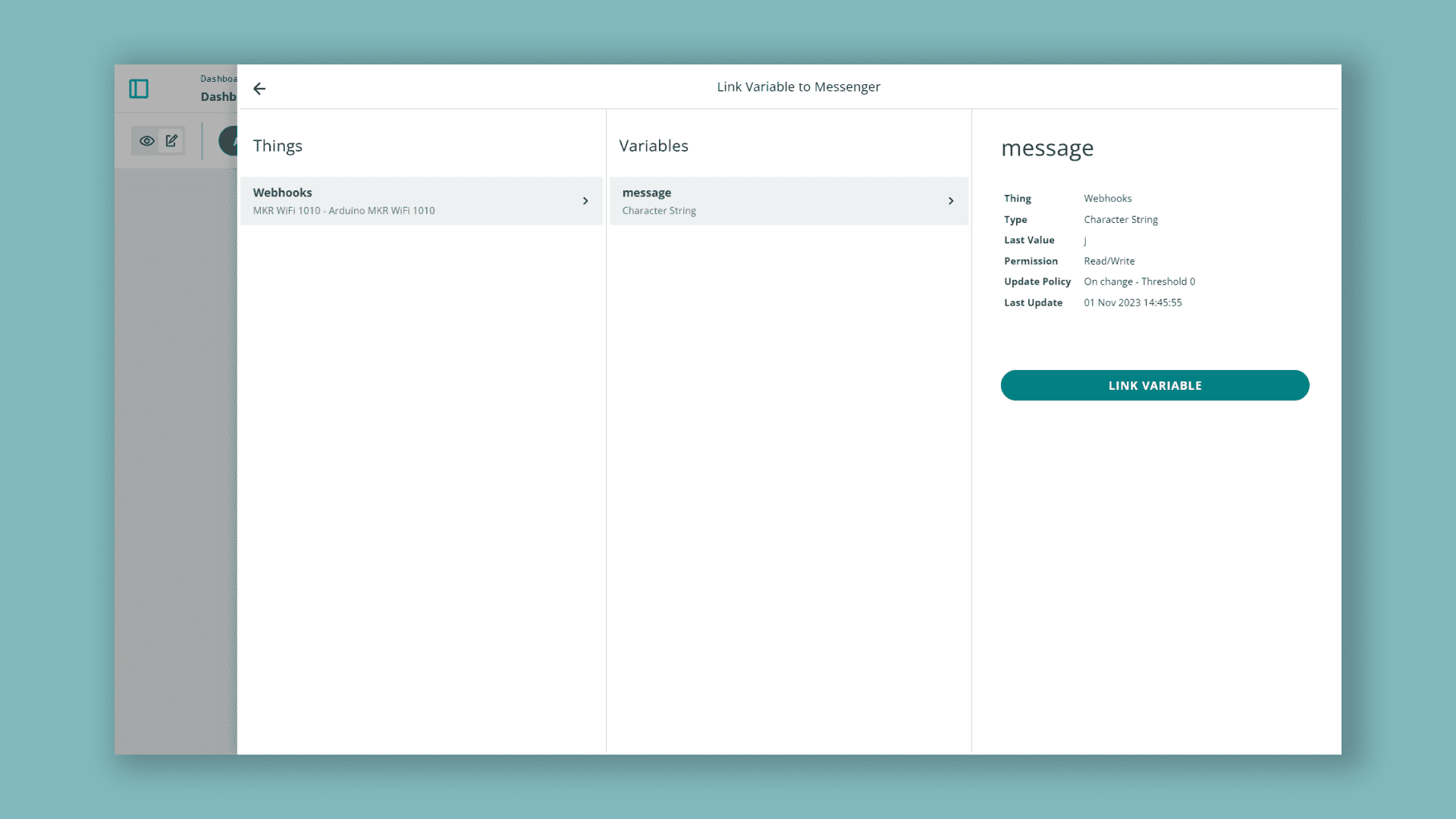 2. Press on Link Variable, select the Thing we created, then the "message" Variable.