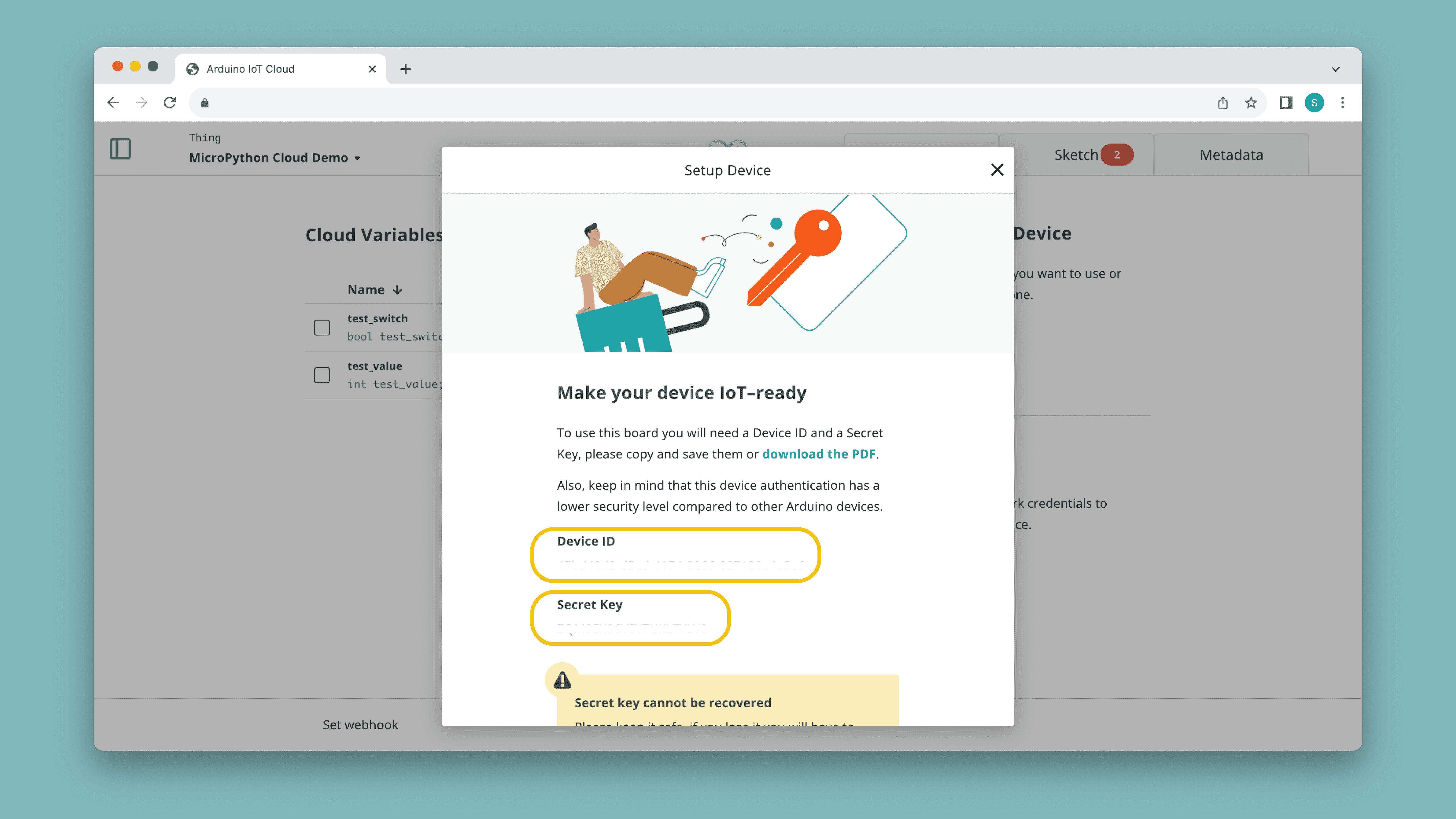 Manual devices are designed for interfacing with JavaScript, Python & MicroPython, and can for example run on a Raspberry Pi, but also on any. Creating a manual device generates a secret key that can together with the device ID be used to securely connect to the Arduino Cloud.