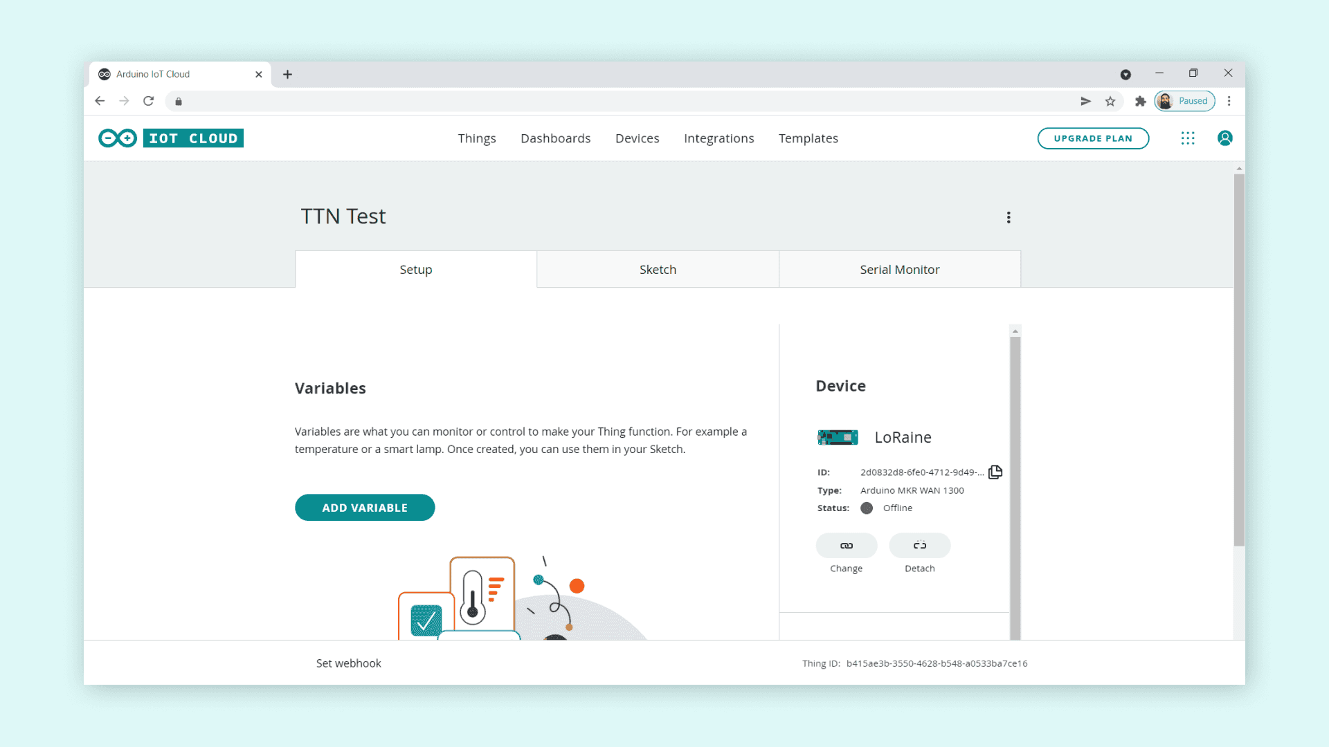 In this step, we will complete the Arduino Cloud setup that we started earlier by configuring a device. We will create a simple test variable, that we will use to send data from the MKR WAN 1300/1310 device. This will just be a counter that updates 3 minutes, to see if the data can be successfully sent from the end device to the Arduino Cloud via the The Things Network.