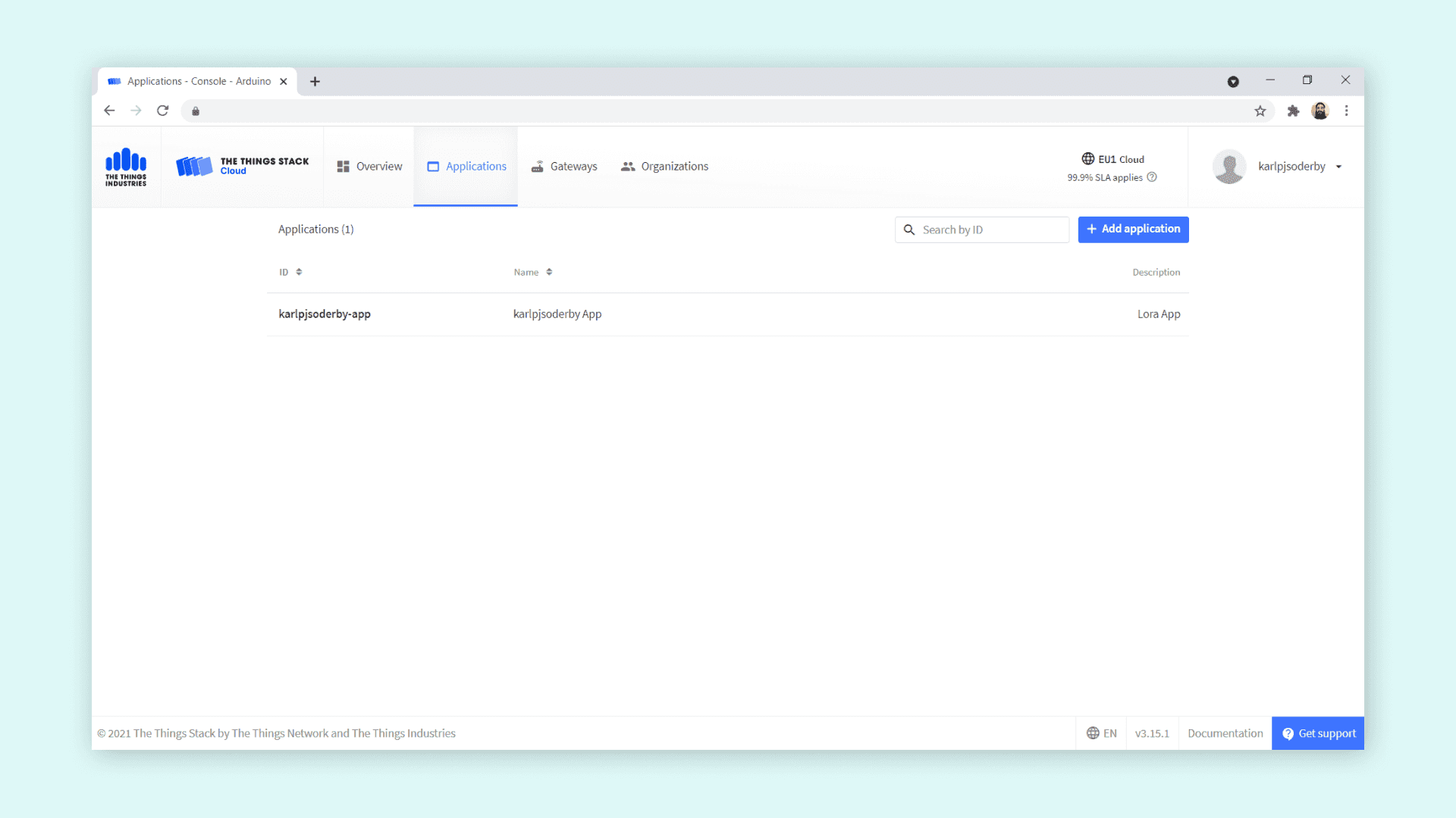 item from the list.8. You are now in the application overview. Here you will find a lot of useful information, such as DevEUI, AppEUI & AppKey, and see the live data that is sent to and from your device. You do not need to make any changes here, but it acts as a great troubleshooting tool to check if your device is working.