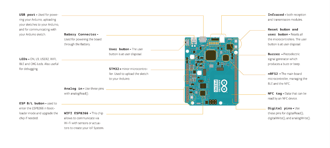 Your Arduino Primo maintains full compatibility with UNO shields and offers you some new connectors and features. The following picture details the various hardware parts of the Primo board..