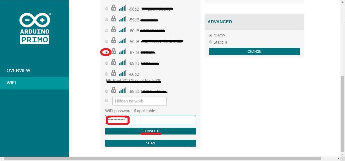 Connect the Arduino Primo to yours Access Point Router, selecting your network from WiFi Connection Menu. Type the correct password and click on CONNECT, as shown in the below image: