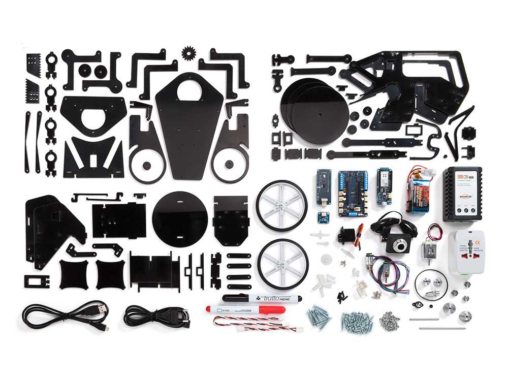 The kit is sold in a hard plastic, stackable tool box for storage and years of reuse. Inside the box is an easy-to-use Arduino MKR1000 board, several customized parts, and a complete set of electrical and mechanical components needed to assemble all three projects.