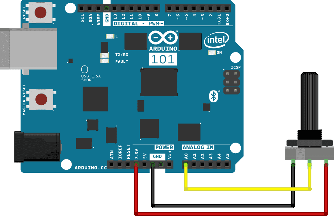 The board has an embedded Bluetooth® Low Energy module, therefore it is enough to connect the board to the computer and use the Serial Monitor to read the messages sent by the sketch. A potentiometer is connected to 3.3V, GND and A0 to simulate the charge of a battery.