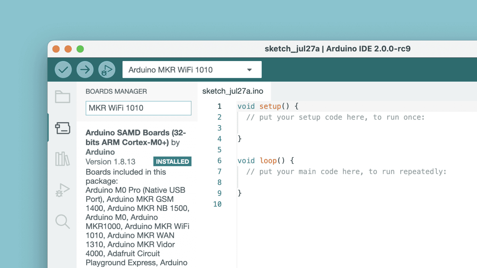 • Boards Manager - browse through Arduino & third party packages that can be installed. For example, using a MKR WiFi 1010 board requires the