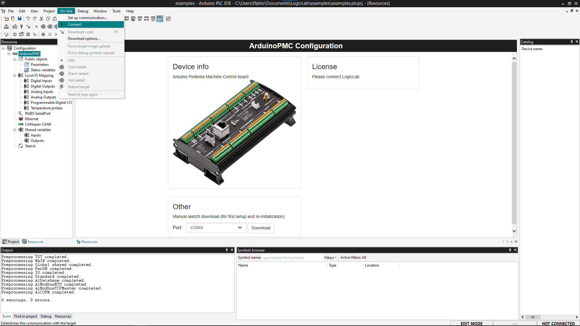 This tutorial will show you how to connect the Portenta Machine Control and Opta™ to the Arduino PLC IDE, learning how to activate the software license and the basic setup to have your board up and running with the Arduino PLC IDE.
