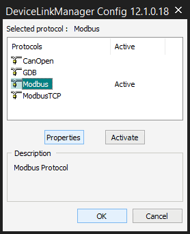 Make sure the Modbus protocol is using the secondary Serial port number, the Modbus Virtual port you took note of before. Press OK.