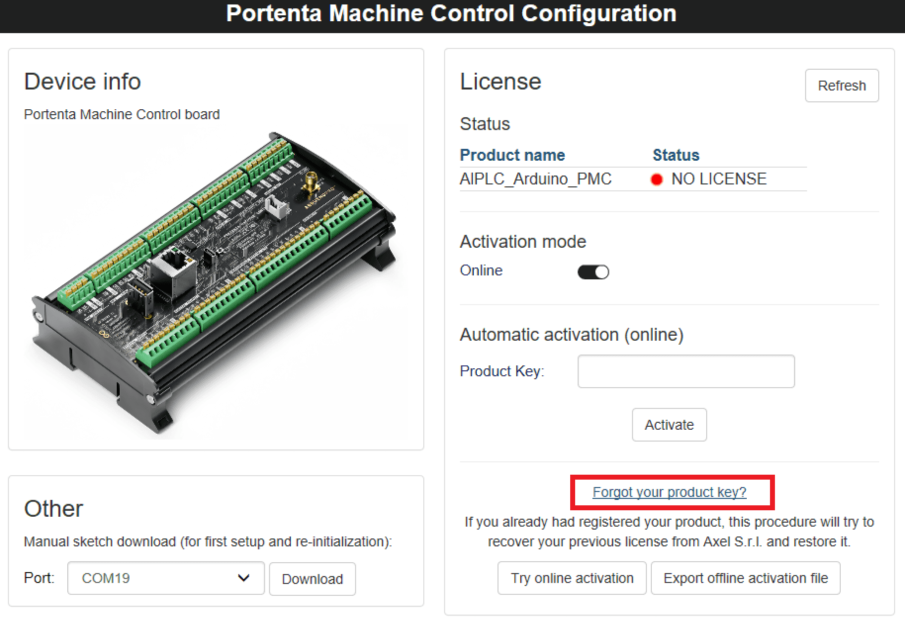 In case the hardware is being reflashed and the key got lost, the license can be recovered just by clicking the "Forgot your Product Key?" button: