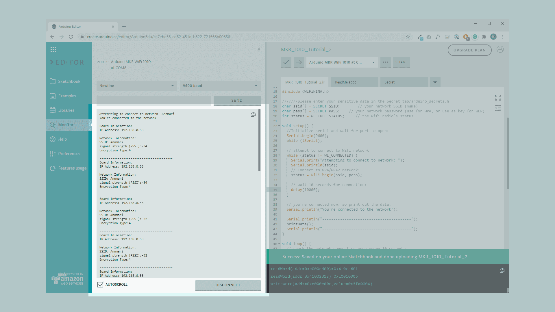 Once we are finished with the coding, we can upload the sketch to the board. When it has been successfully uploaded, open the Serial Monitor and the results should match the following images. Note that the network information in this example is greyed out for security reasons.
