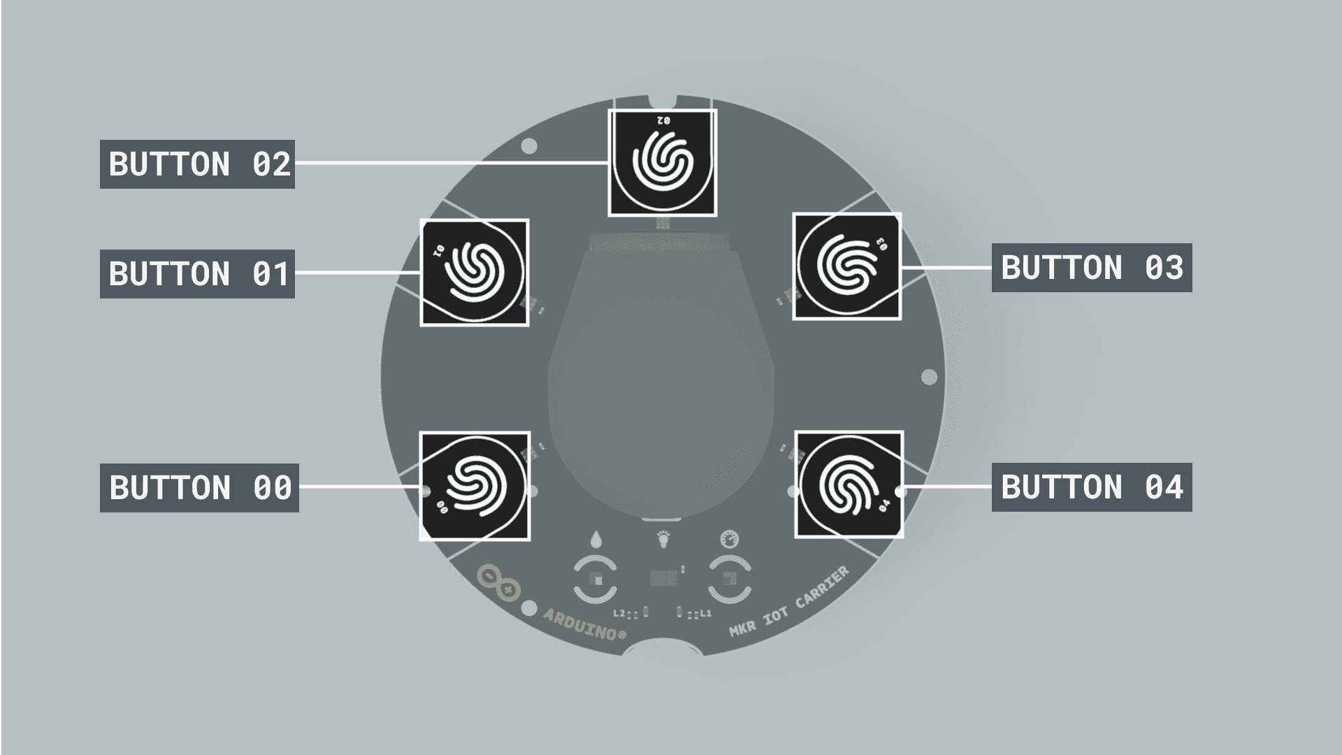The MKR IoT Carrier comes with 5 digital RGB LEDs placed on the top side of the carrier in front of the buttons.