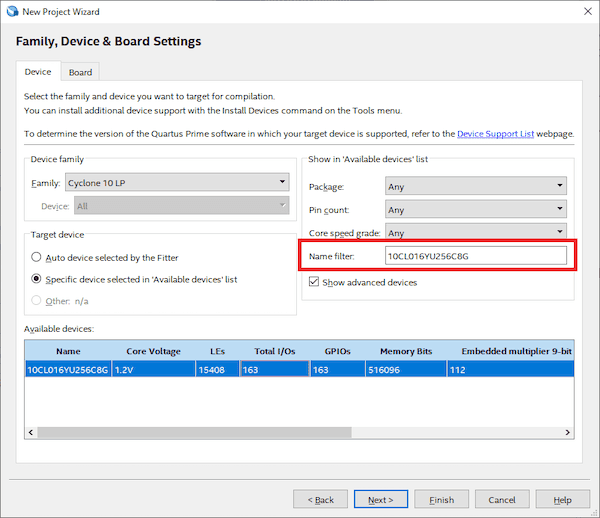 The exact model number is printed on the chip. Skip the sixth screen for now. This pane is only needed if you use other programs outside of the Quartus Toolchain that you need to integrate into the compile process. On the last screen, review the settings and click finish.