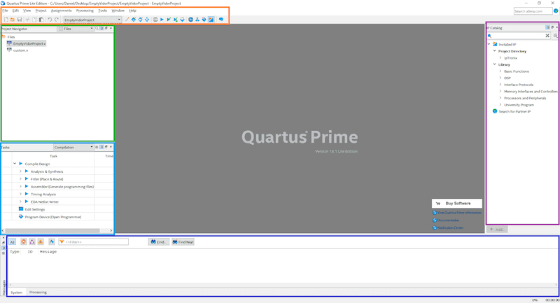 • IP catalog (purple): This can be used to search and select IPs for your design. IPs (Intellectual Properties) are pre-built blocks for common recurring tasks, like communication protocols and signal generation.