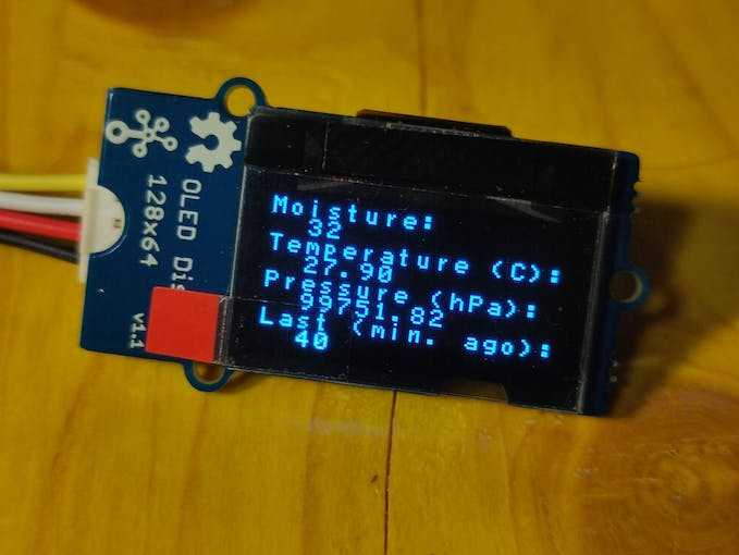 1//1^ & 2^ rows: the moisture value2 SeeedOled.setTextXY(0, 0); 3 SeeedOled.putString("Moisture:");4 //empty the row5 SeeedOled.setTextXY(1, 2);6 SeeedOled.putString(" ");7 //...and then write the new value8 SeeedOled.setTextXY(1, 2);9 SeeedOled.putNumber(moistureStatus);10 //3^ & 4^ rows: the temperature value11 SeeedOled.setTextXY(2, 0);12 SeeedOled.putString("Temperature (C):");13 SeeedOled.setTextXY(3, 2);14 SeeedOled.putString(" ");15 SeeedOled.setTextXY(3, 2);16 SeeedOled.putFloat(temperature);17 //5^ & 6^ rows: the pressure value18 SeeedOled.setTextXY(4, 0);19 SeeedOled.putString("Pressure (hPa):");20 SeeedOled.setTextXY(5, 2);21 SeeedOled.putString(" ");22 SeeedOled.setTextXY(5, 2);23 SeeedOled.putFloat(pressure);24 //7^ & 8^ rows: Last watering25 SeeedOled.setTextXY(6, 0);26 SeeedOled.putString("Last (min. ago):");27 SeeedOled.setTextXY(7, 2);28 SeeedOled.putString(" ");29 SeeedOled.setTextXY(7, 2);30 //milliseconds / 1000 -> seconds / 60 -> minutes31 SeeedOled.putNumber(last_watering_ago / 1000 / 60);