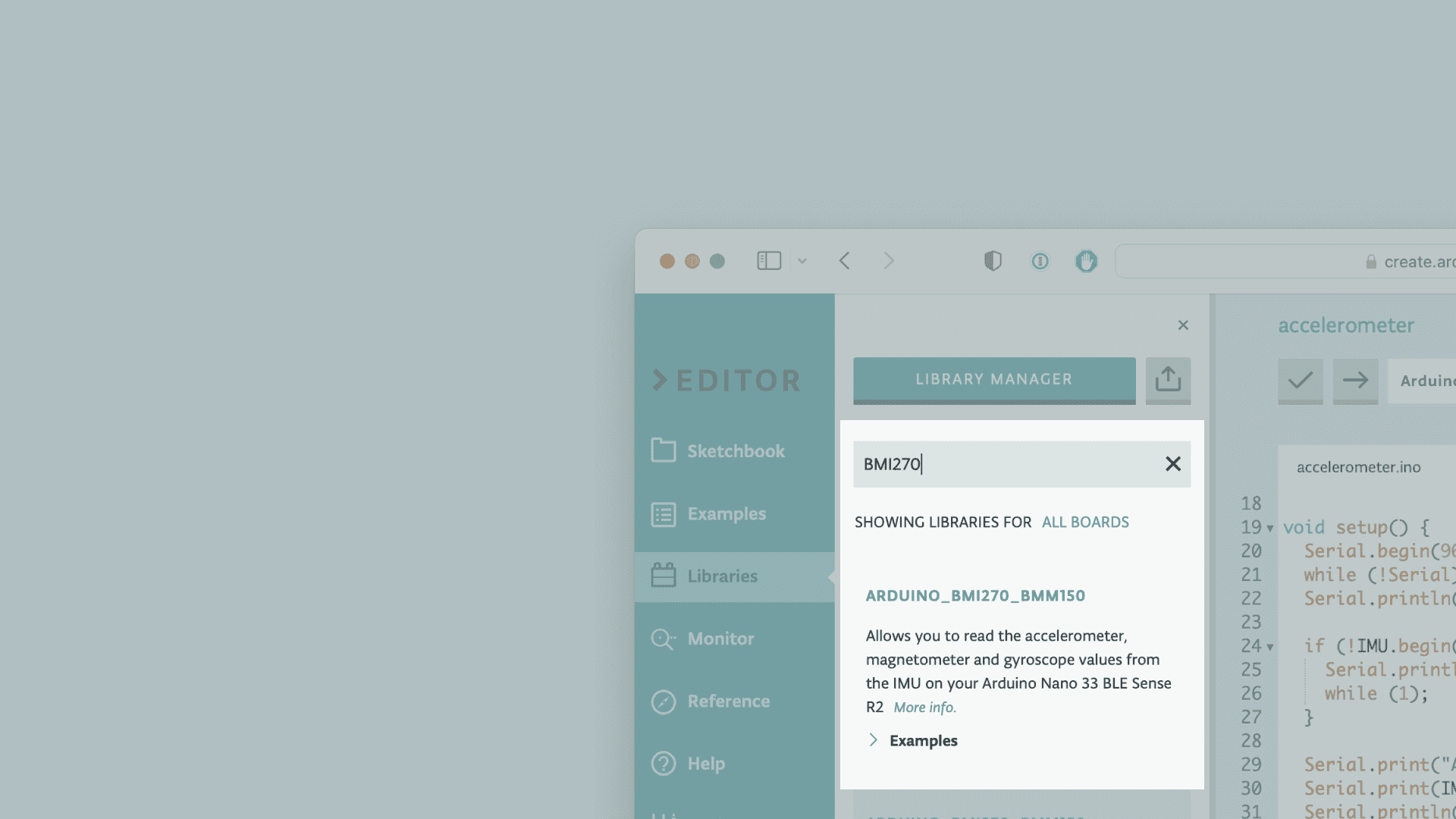 Let's start by opening the Arduino Web Editor, click on the Libraries tab and search for the BMI270_BMM150 library. Then in > Examples, open the SimpleGyroscope sketch and once it opens, rename it as Gyroscope.