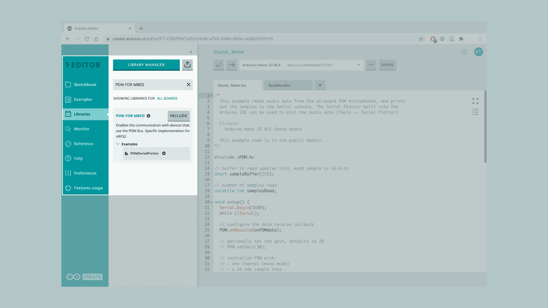 Let's start by opening the Arduino Web Editor, click on the Libraries tab, search for the PDM FOR MBED library, then in Examples, open the PDMSerialPlotter example. Once the sketch is open, rename it as Sound_Meter.