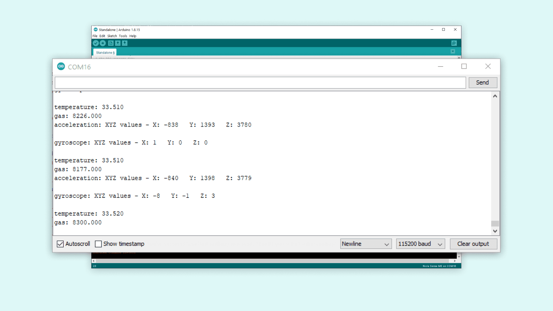 After you have uploaded the sketch to the board, open the Serial Monitor in the Arduino IDE. You should see similar outputs to the ones shown in the image below. Make sure that the baud rate on your serial monitor is set to 115200.
