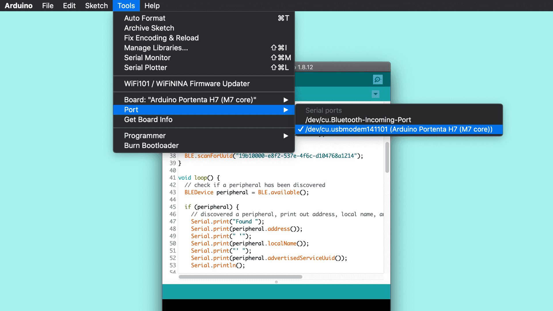 Choose the Port where your Portenta is connected to and Upload the sketch. Open the Serial Monitor once you have uploaded the code to the board to see debugging messages. If the Bluetooth® Low Energy setup was successful, you should see the message