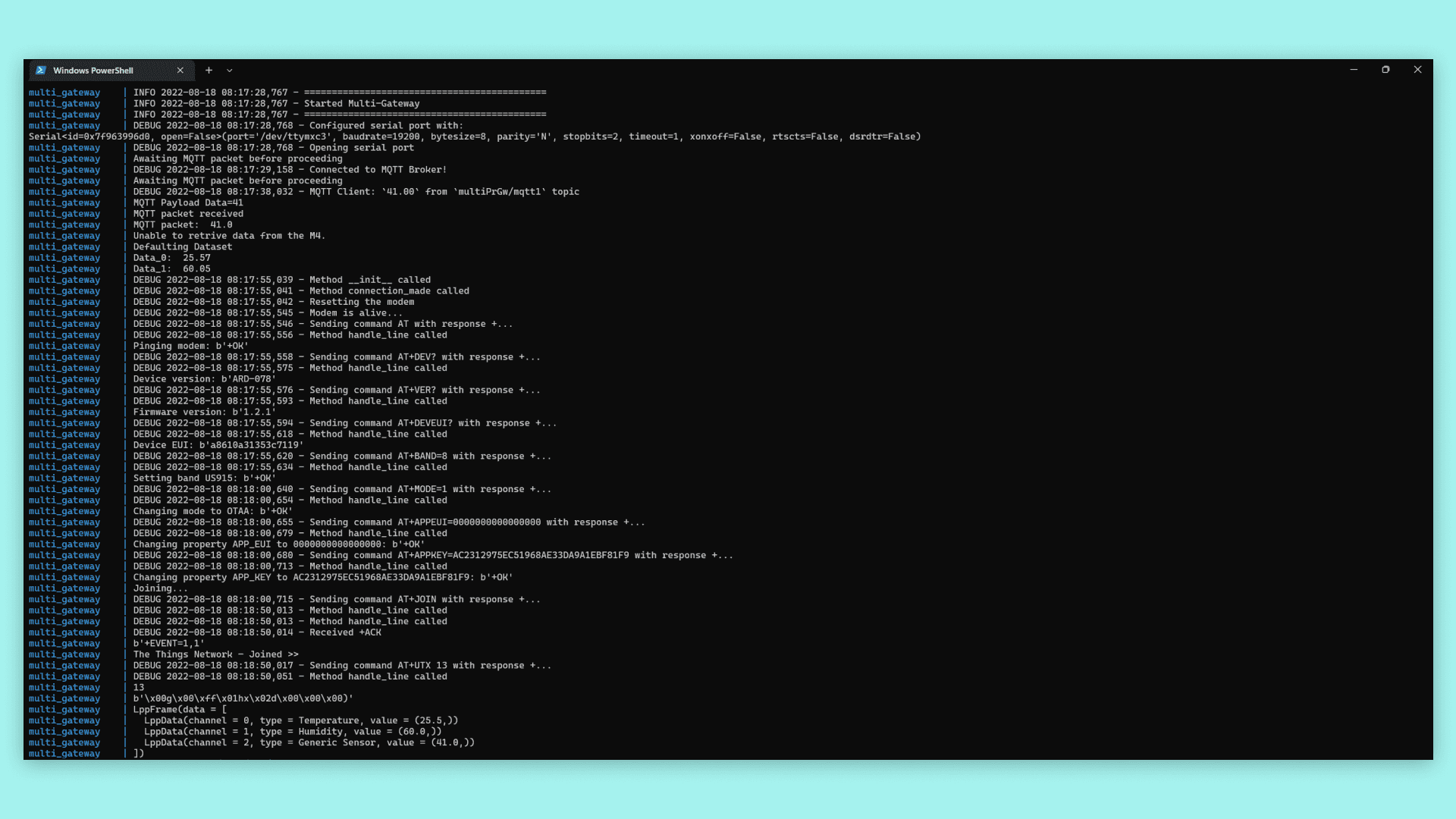 This is the main Python® script that will handle the overall networking process. We will highlight important lines of the code to help you understand how these code pieces work together to build a gateway based on multiple protocols. For the full Python® script, please refer to the files here.