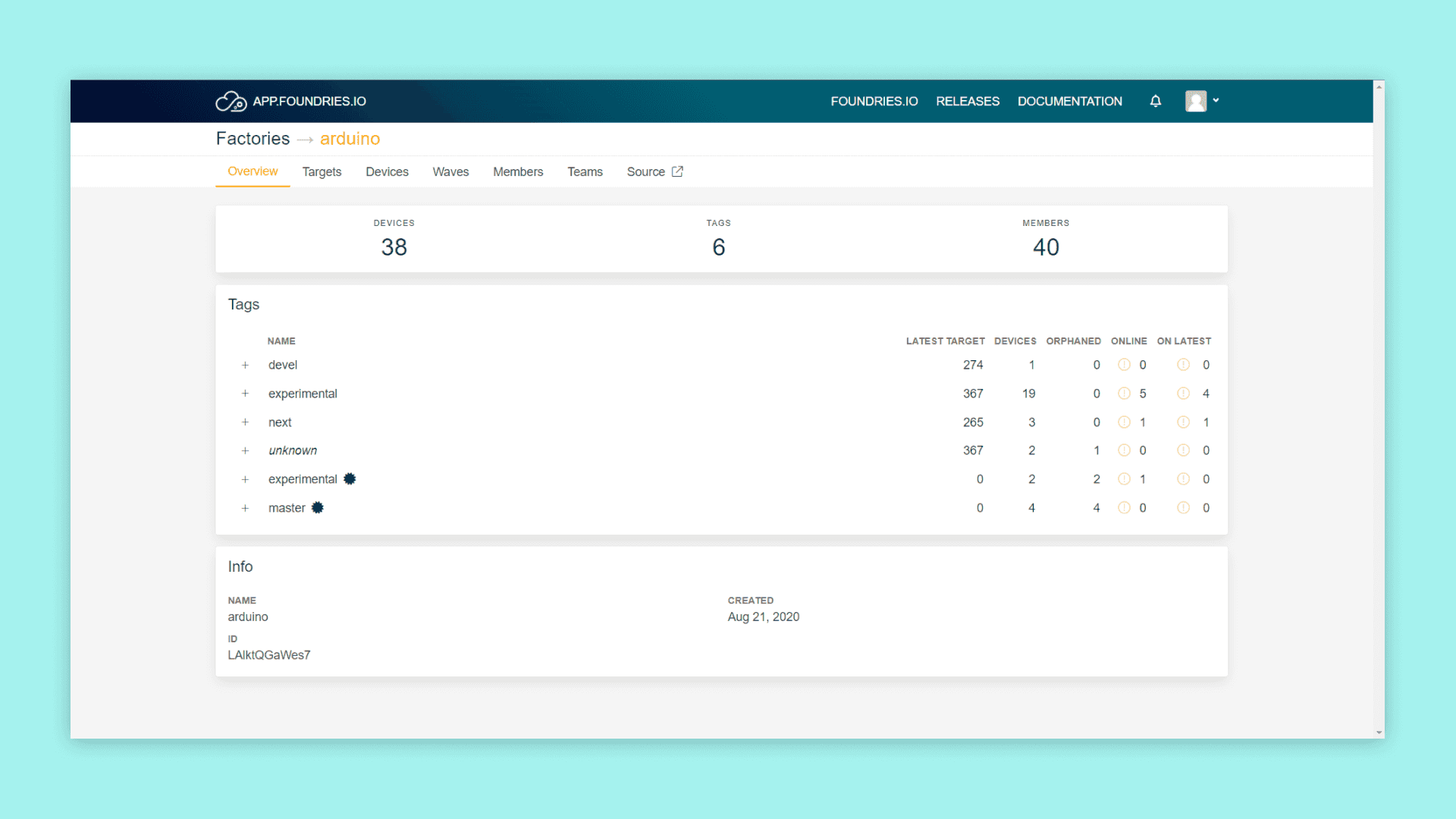 Your Factory page allows you to add members so that you can easily keep track of the members of your team that should have access to the Portenta X8's that are linked to your Factory. You can also set up teams for better management. On the page, you can also find a list of all devices linked to the Factory, along with their name and version of the container currently uploaded to the board. On the containers page, you can find all the different versions of containers uploaded to the Factory.